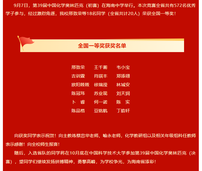 海口中学18名学子斩获第39届中国化学奥林匹克(初赛)全国一等奖